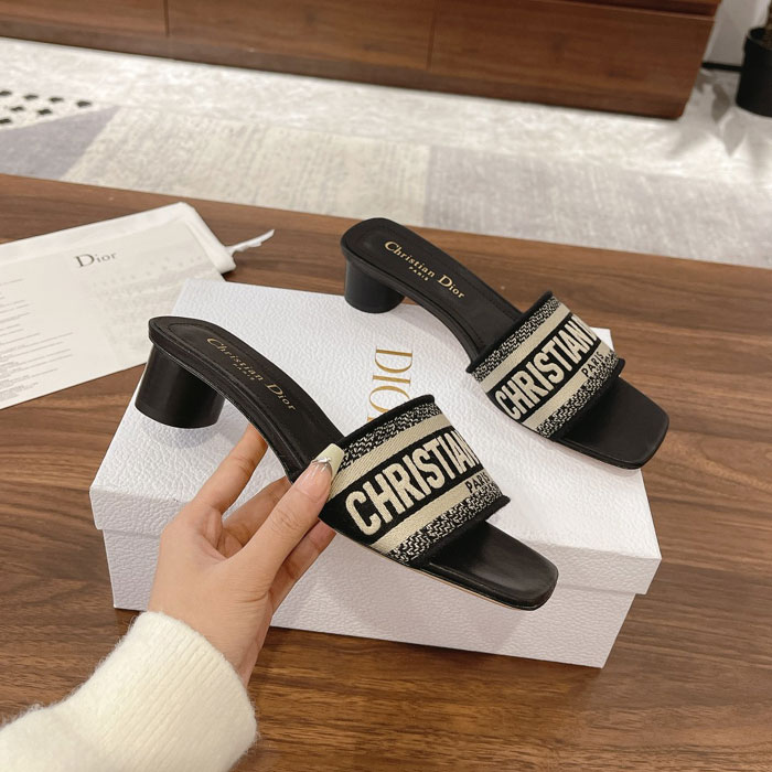 The stylish Dway slide showcases a sophisticated deep blue cotton upper, adorned with the iconic Christian Dior Paris embroidery.