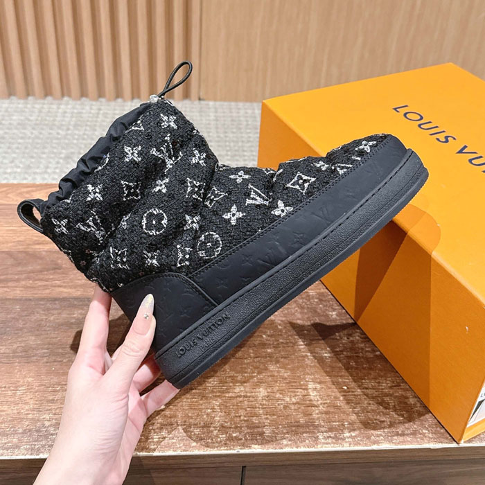Introducing the stylish LV Cloud Ankle Boot Sneaker from Louis Vuitton's winter collection. This fashionable hybrid blends comfort and luxury, featuring Monogram tweed accents paired with embossed calf leather.