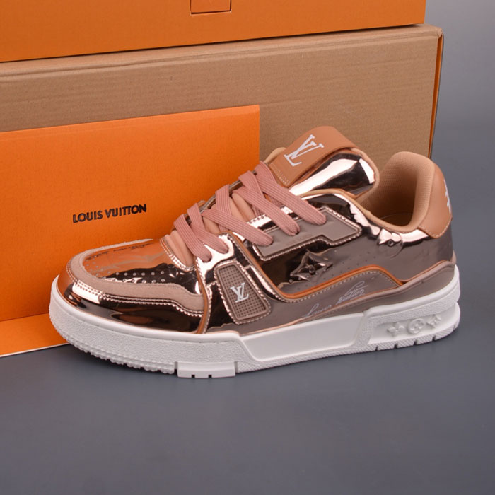 Introducing the redesigned LV Trainer sneaker by Louis Vuitton - now with feminine touches while maintaining its signature style. Originally created by Virgil Abloh for men, this version features striking metallic leather with partial Monogram embossing.
